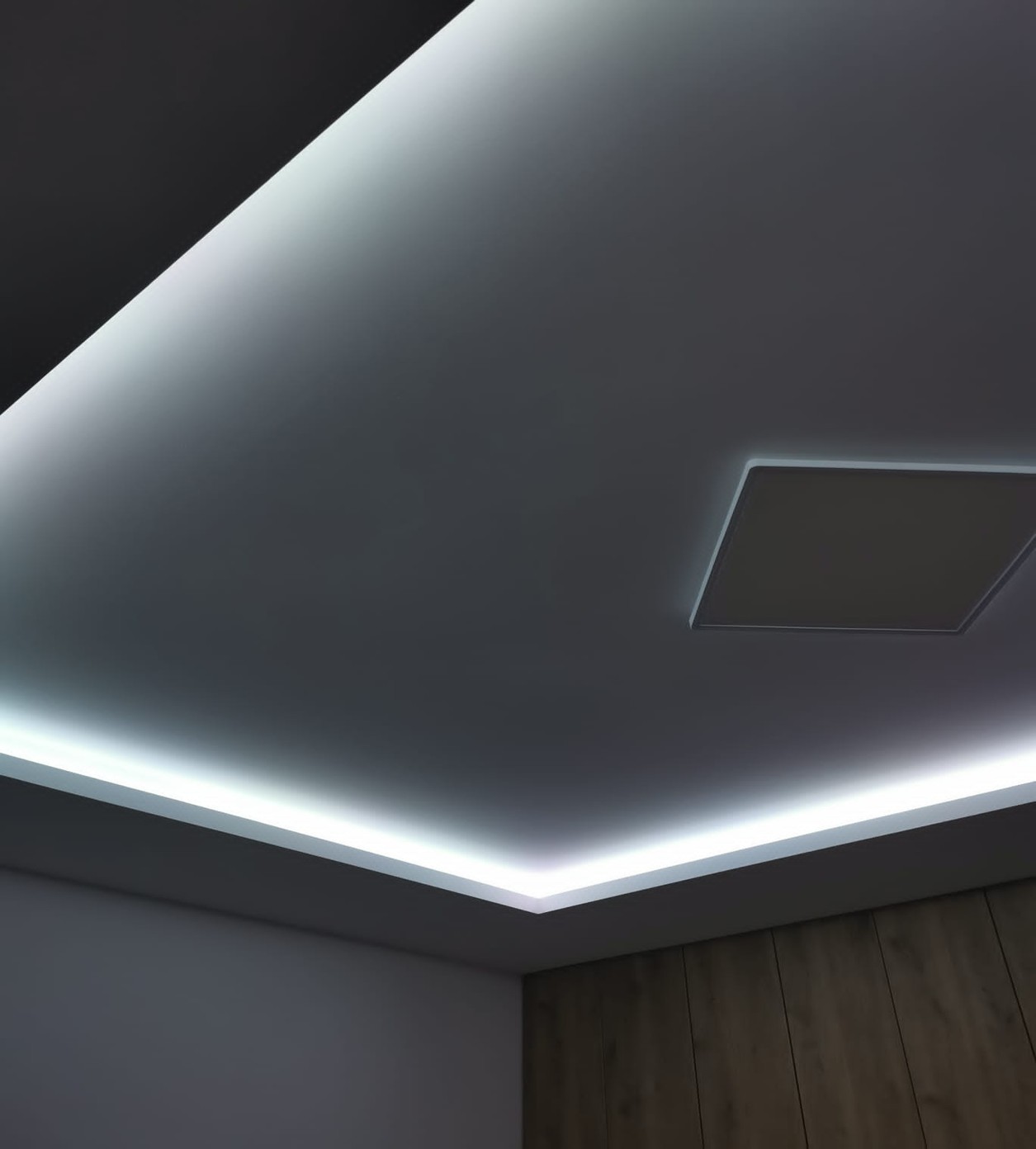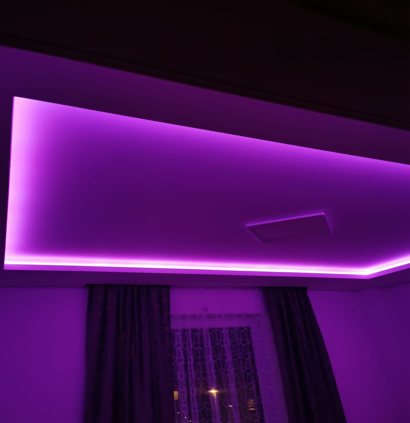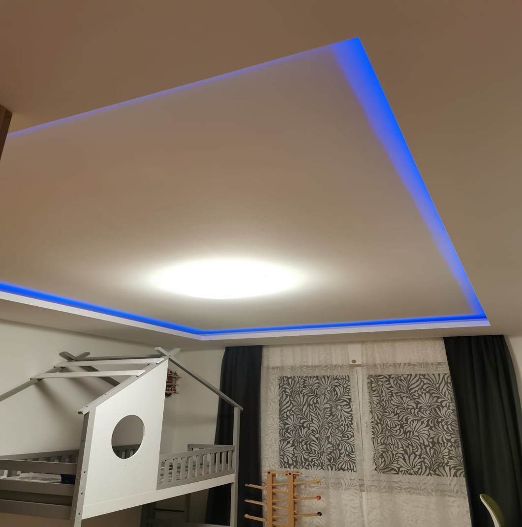 Die Kombination aus indirekter RGB-LED-Beleuchtung, präziser Trockenbaukonstruktion und sauberer Oberflächenbearbeitung schafft ein atmosphärisches, funktionales und gestalterisch anspruchsvolles Wohnumfeld – technisch einwandfrei und architektonisch harmonisch umgesetzt.