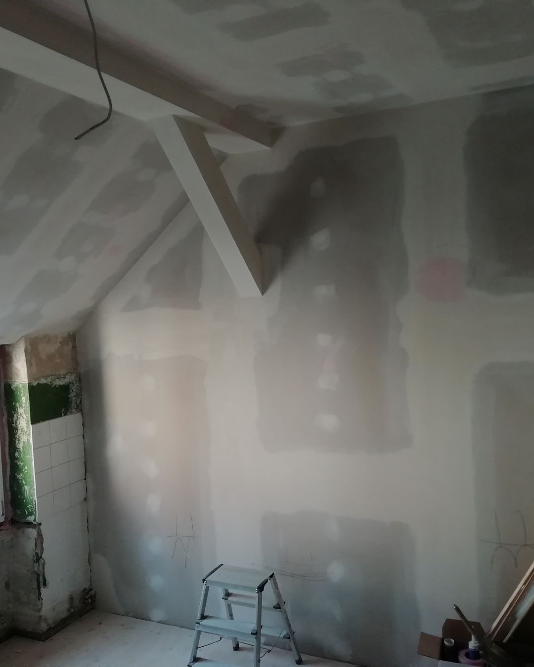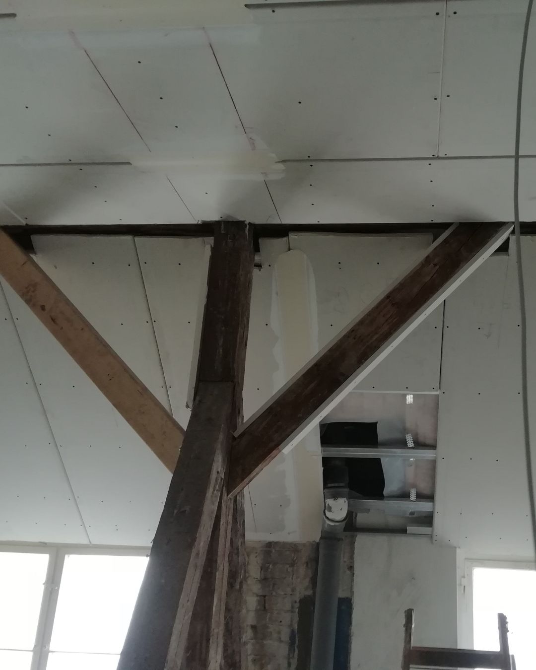 - Herstellung einer brandschutzsicheren Decke in F90-Ausführung. Die Unterkonstruktion wurde exakt ausgerichtet und an die vorhandenen Balken angepasst. Anschließend erfolgte die Beplankung mit GKF-Platten 25 mm sowie vollflächige Verspachtelung.